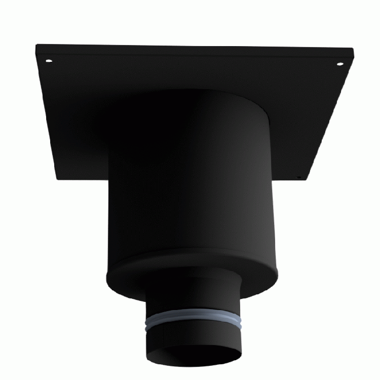 Aansluitstuk incl. afwerkrozet 150/230 is donker antraciet hittebestendig gespoten en past op dubbelwandige rookkanalen met een binnendiameter van 150mm en een buitendiamer van maximaal 230mm. Bijvoorbeeld: Isoduct, maar ook STB, Ritevent, Metalotherm, Poujoulat, etc. De dubbelwandige pijp zakt 150mm door het plafond in het aansluitstuk. Het vierkante rozet is 340x340x15mm. De enkelwandige zijde van het aansluitstuk heeft een diameter van 150mm.
